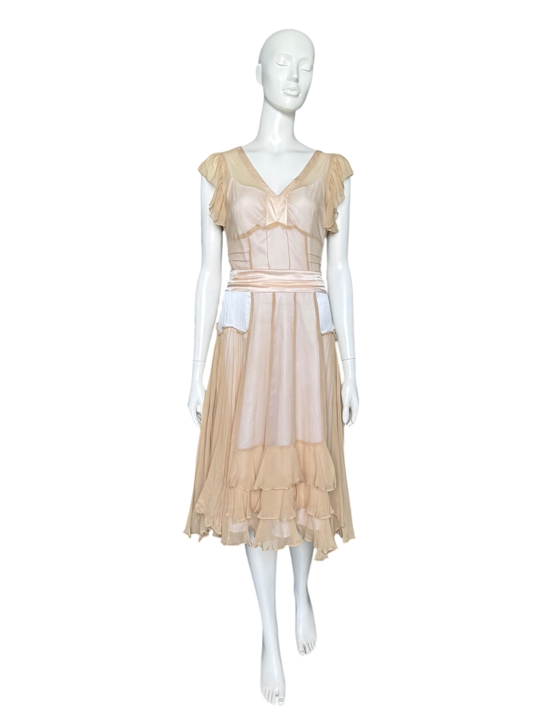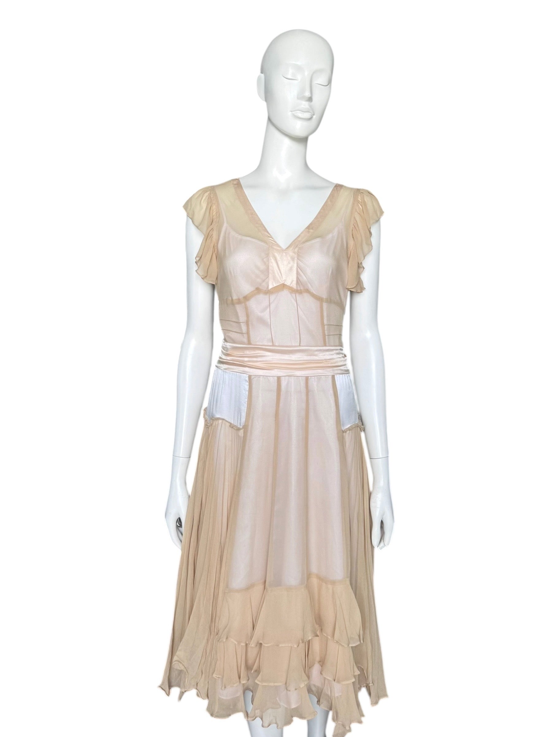 Décolleté en V, manches courtes à ruchés, jeu de transparence et de superpositions signature de la période Phoebe Philo.