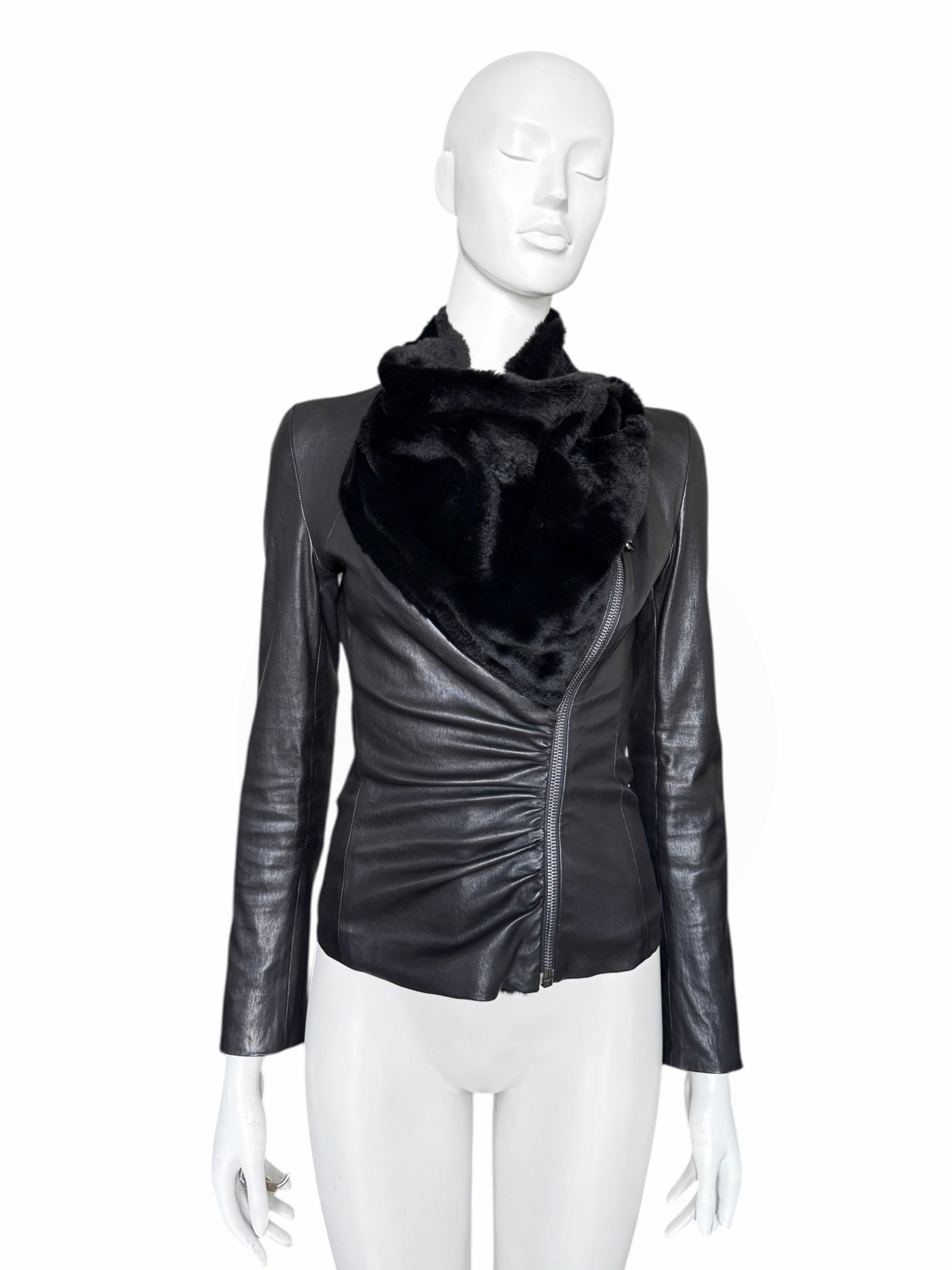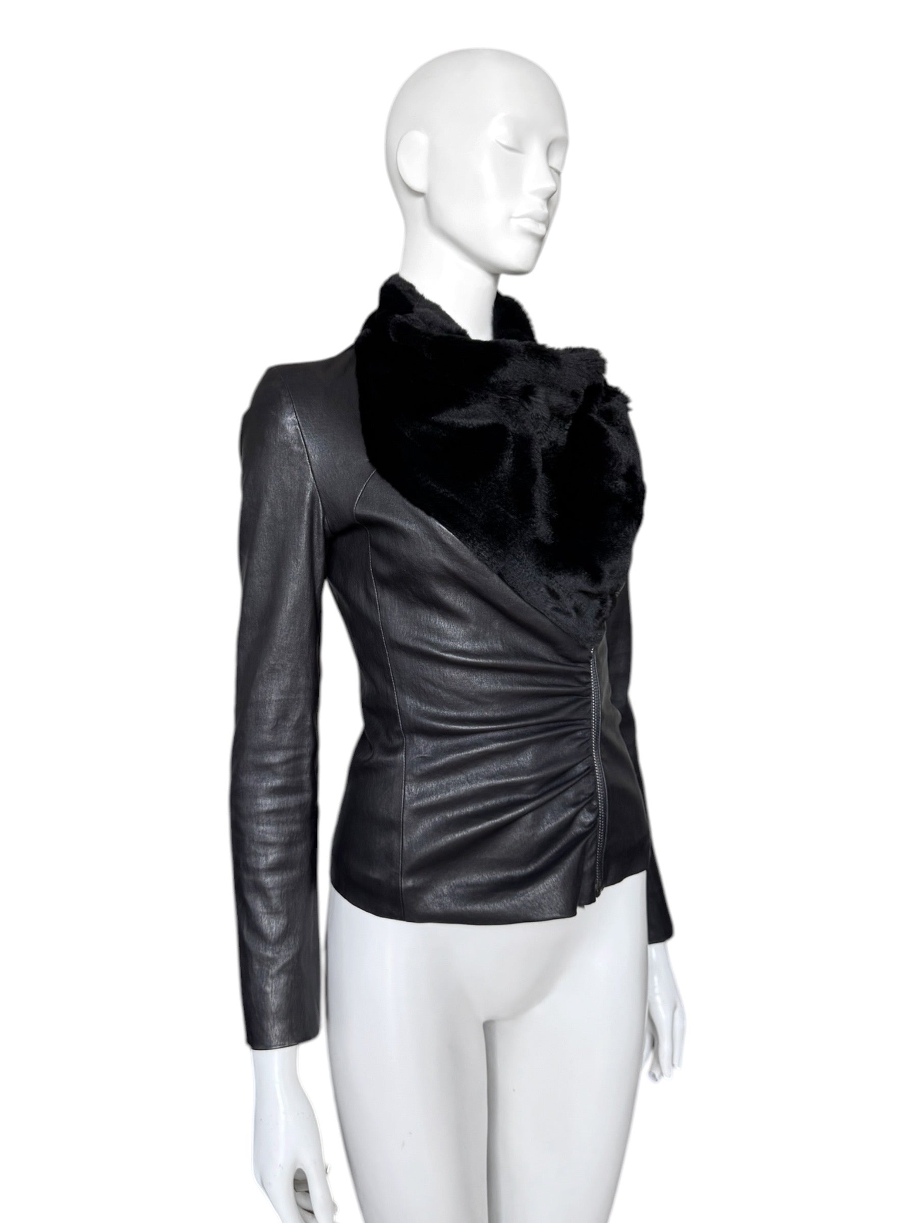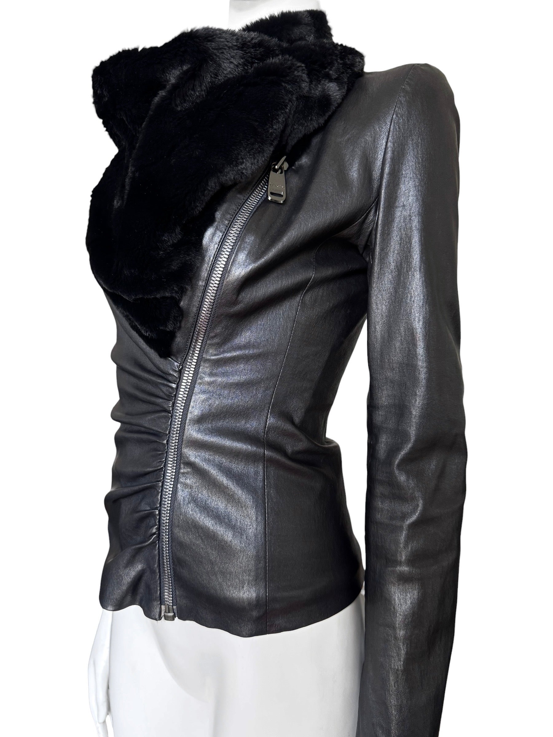 Col en fourrure de lapin, fermeture zippée asymétrique, léger jeu de fronces sur le devant qui structure la silhouette.