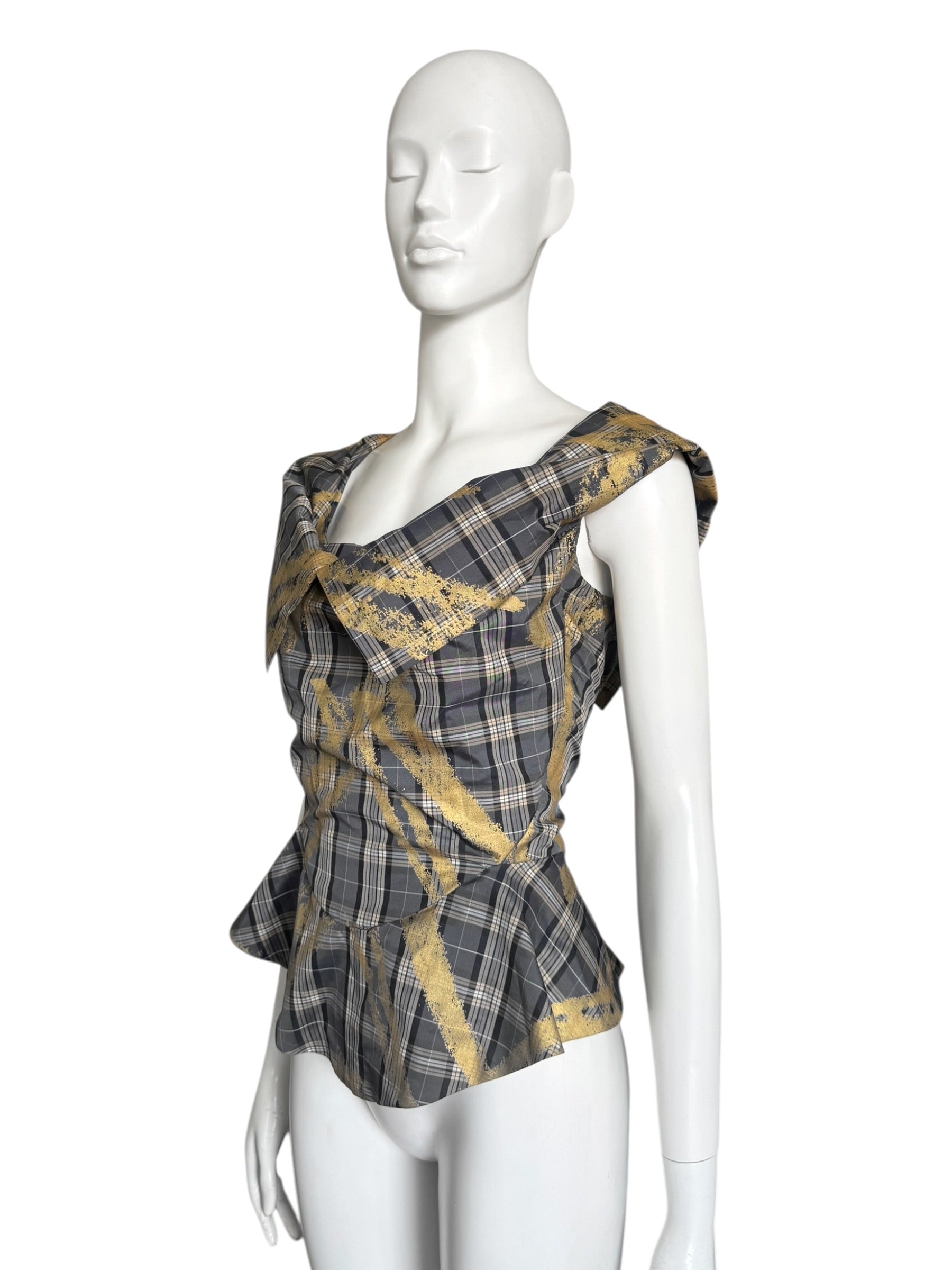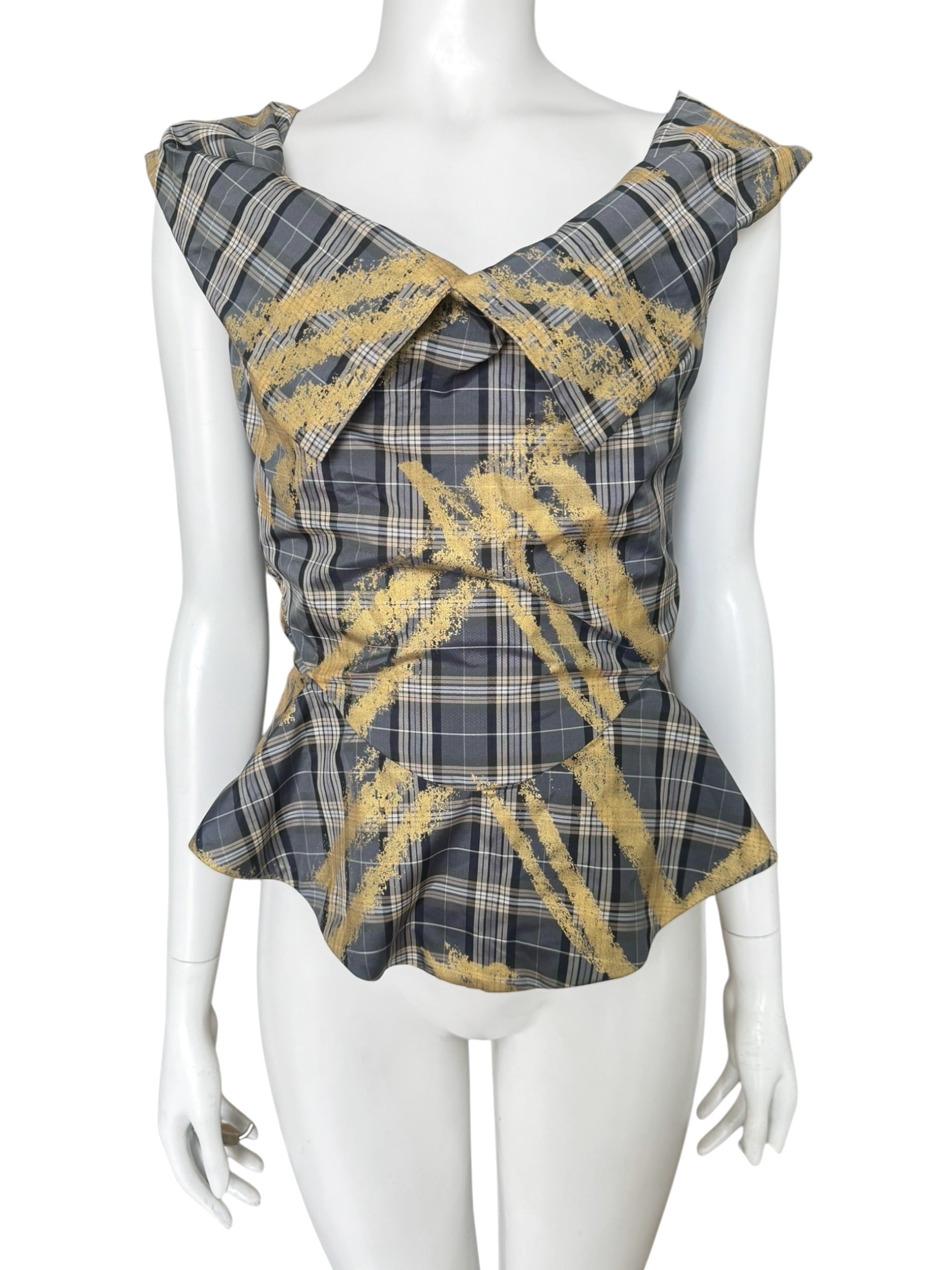 Confectionné en polyester, il se distingue par un motif tartan rehaussé d’un imprimé doré texturé. La construction souple et drapée, sans baleines, joue sur le volume du col et une base légèrement évasée pour structurer la silhouette sans rigidité.