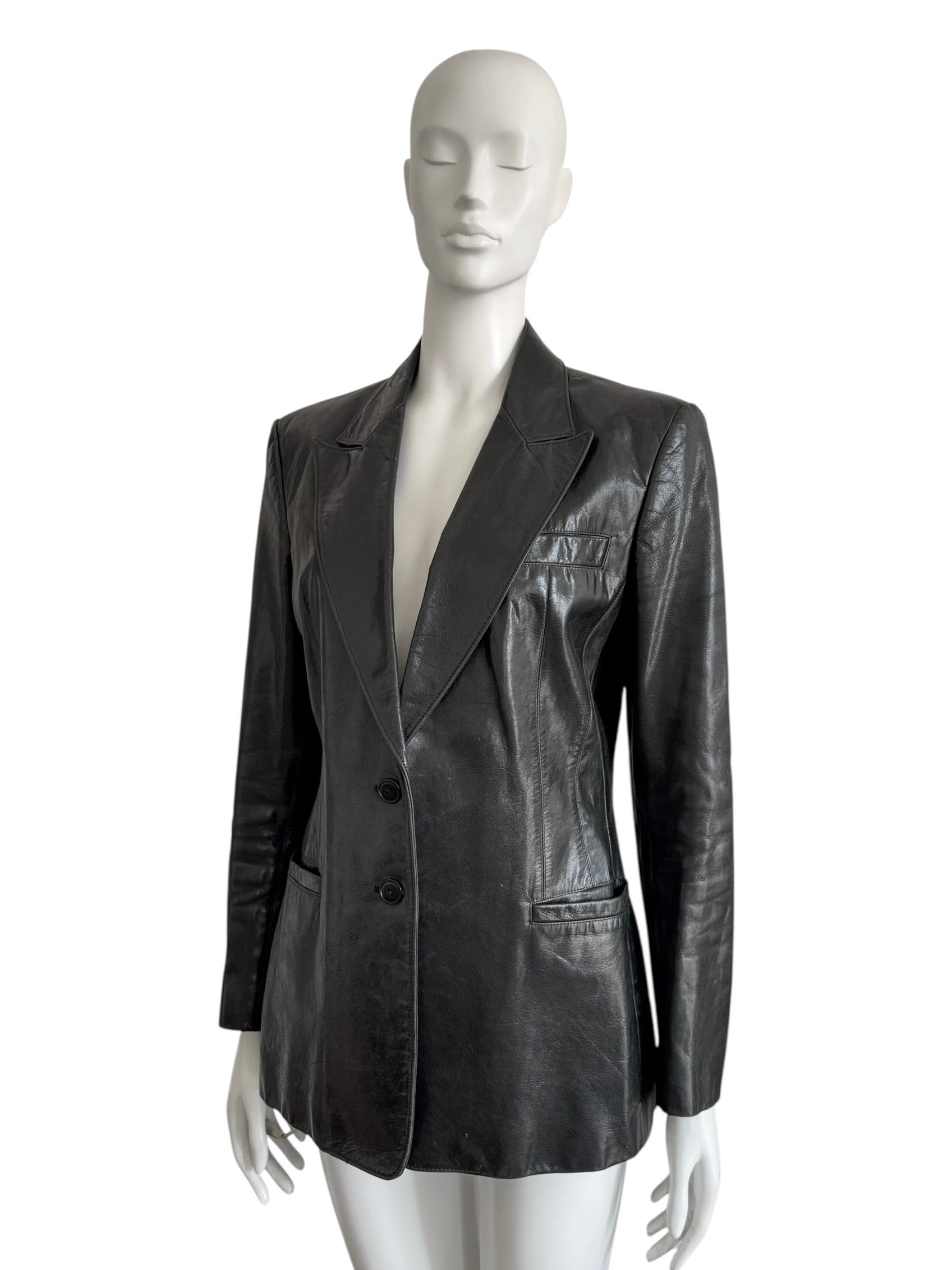 Veste longue en cuir noir lisse. Fabriquée en Italie.