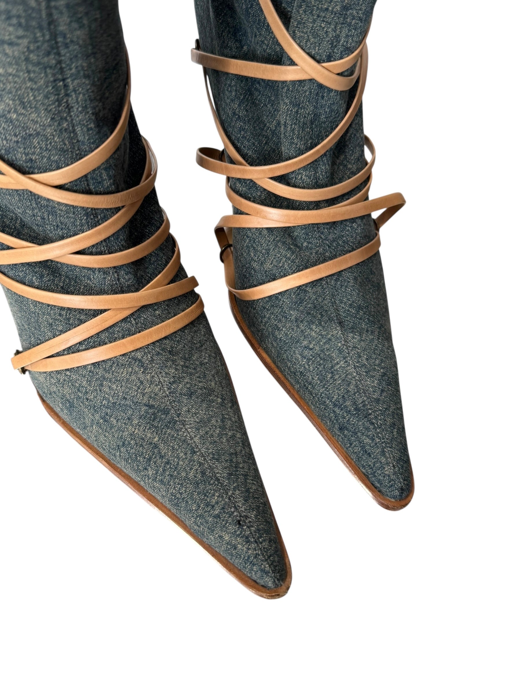 Bottes Plein Sud issue de la collection printemps-été 2003. Design singulier mêlant denim brut et lanières en cuir naturel à nouer autour de botte.