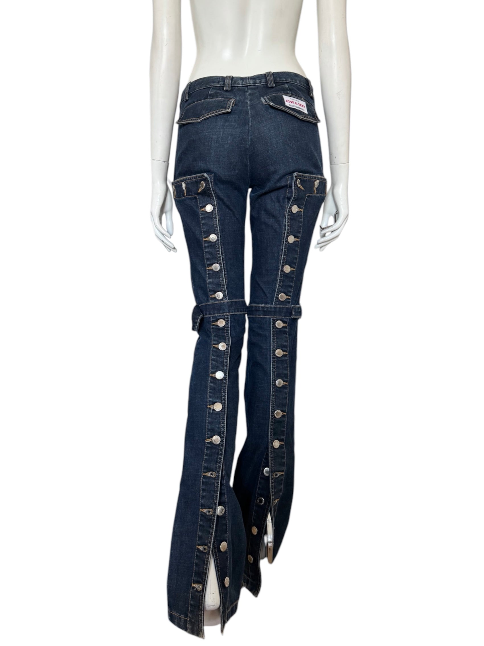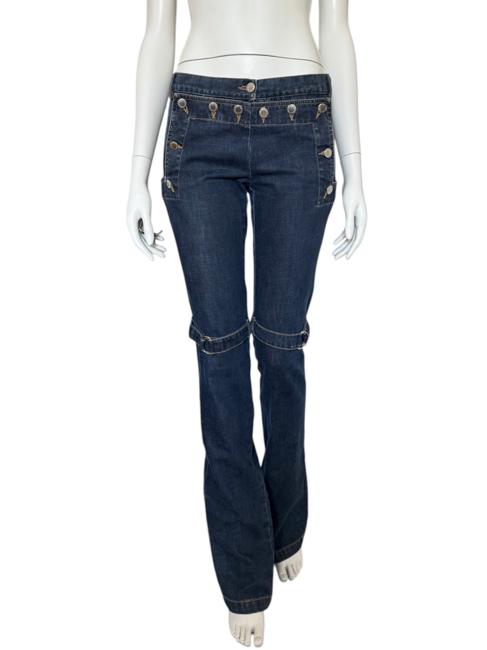 Denim rigide structuré, décoré de boutons argentés gravés et d’anneaux métalliques au niveau des genoux.