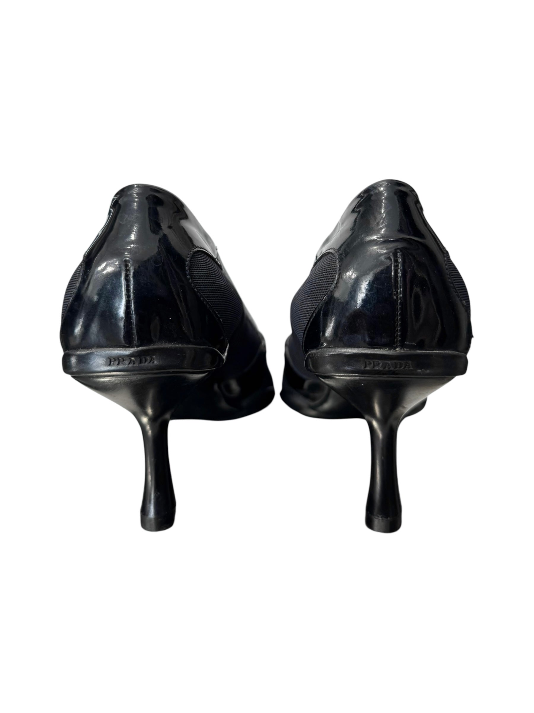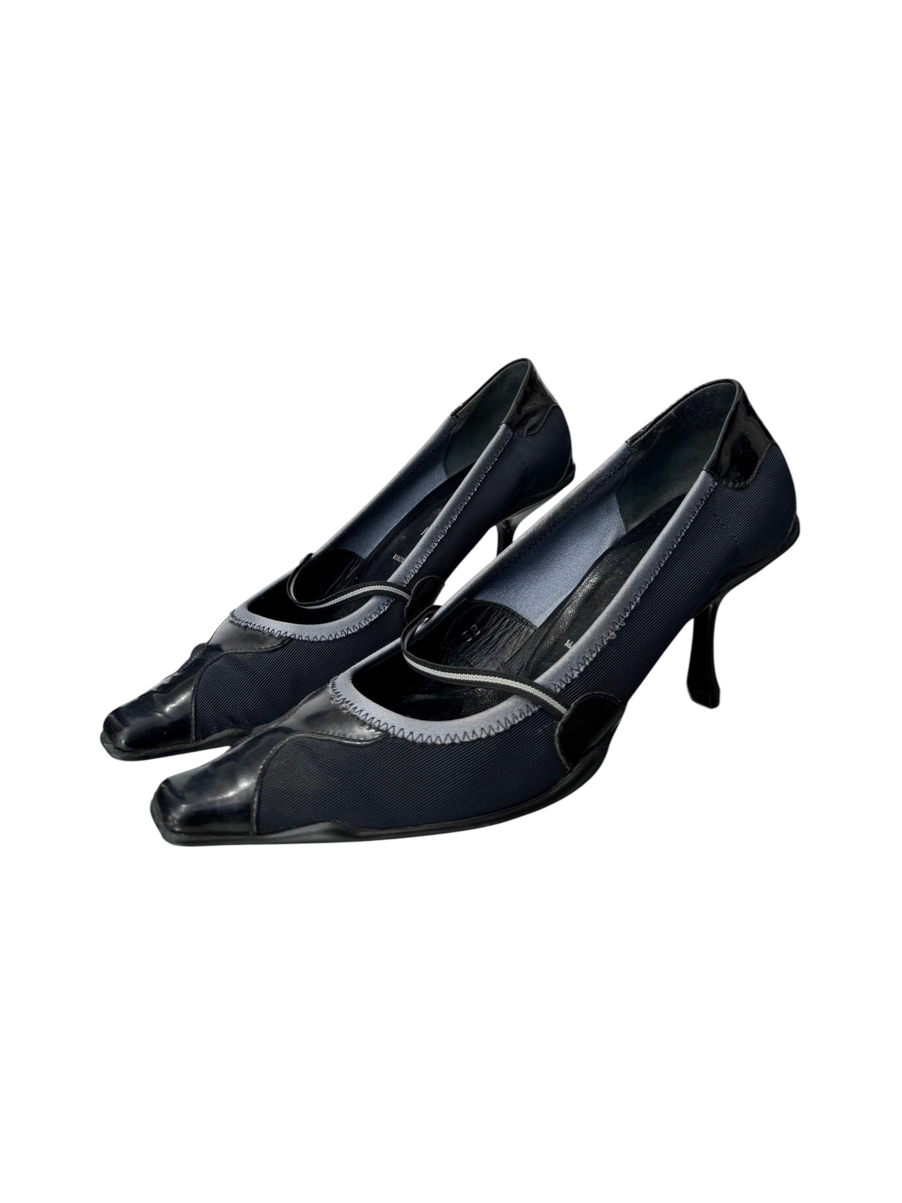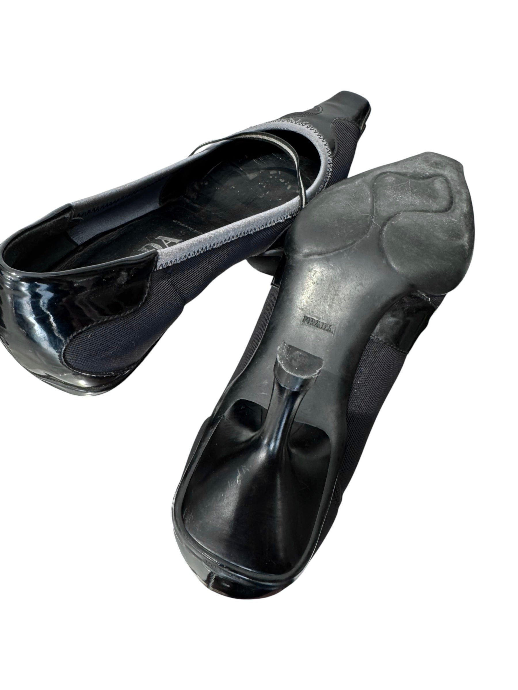 Conçus dans un mélange de nylon stretch noir et de cuir verni, ils présentent une découpe ergonomique à brides croisées, typique des inspirations sport-luxe Prada de la période. Bout carré allongé, talon incurvé sculptural et finitions contrastées en biais gris.