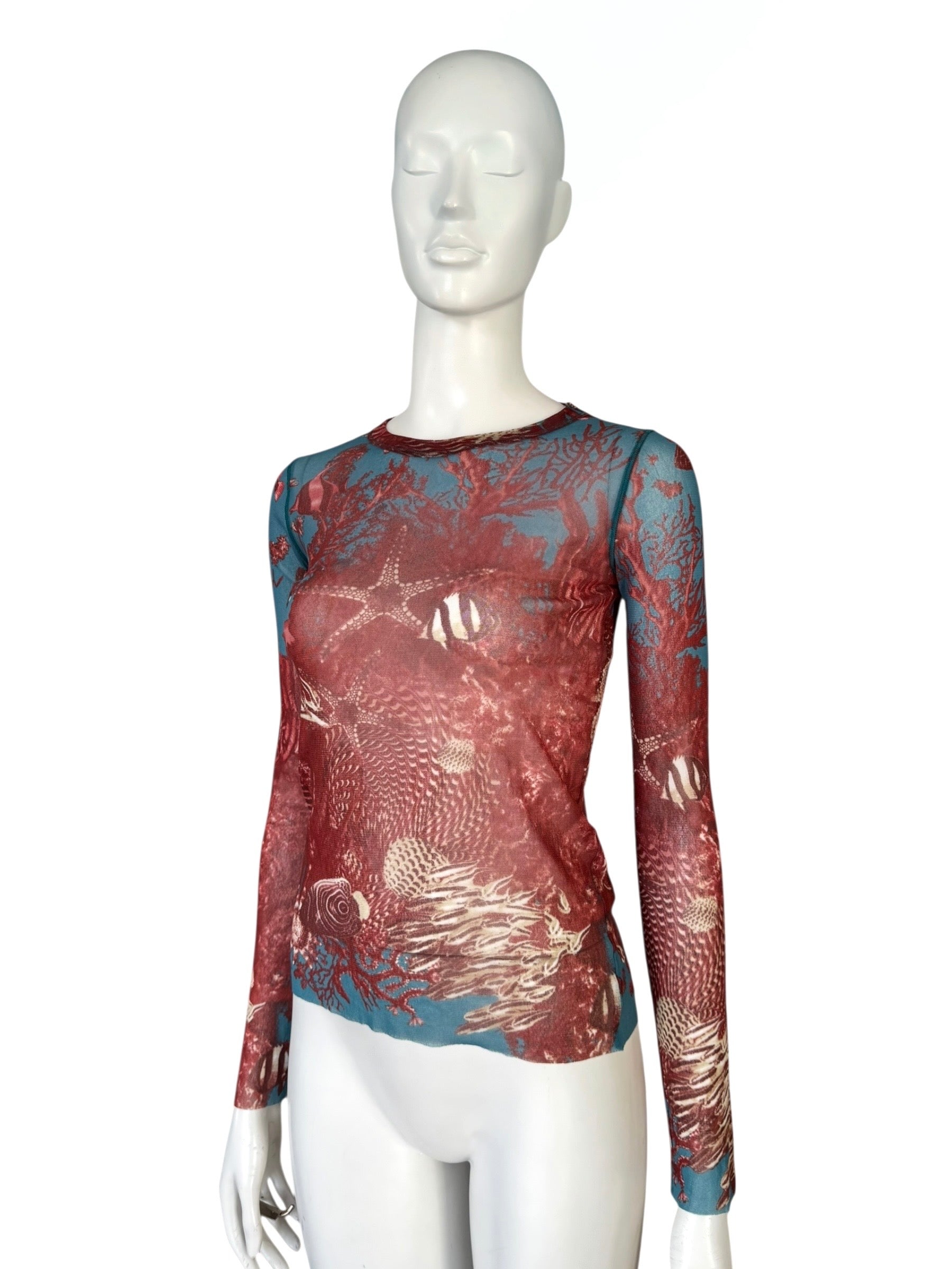 Top en mesh signé Jean-Paul Gaultier, issu des collections 90s et reconnaissable à son imprimé sea life travaillé en surimpression : coraux rouges, étoiles de mer, bancs de poissons — un motif immersif, dense et hypnotique, typique des visuels d’archives de la maison.