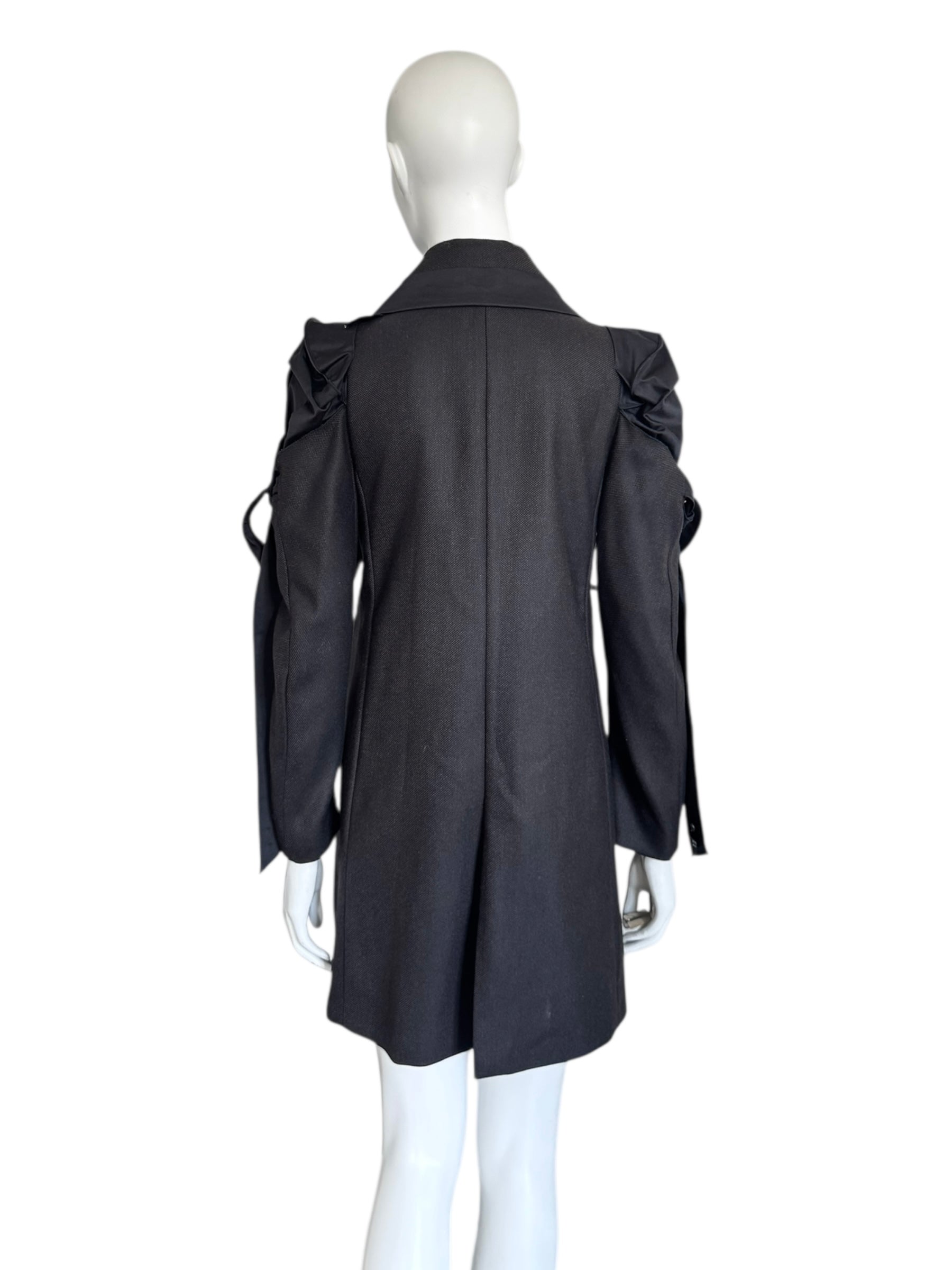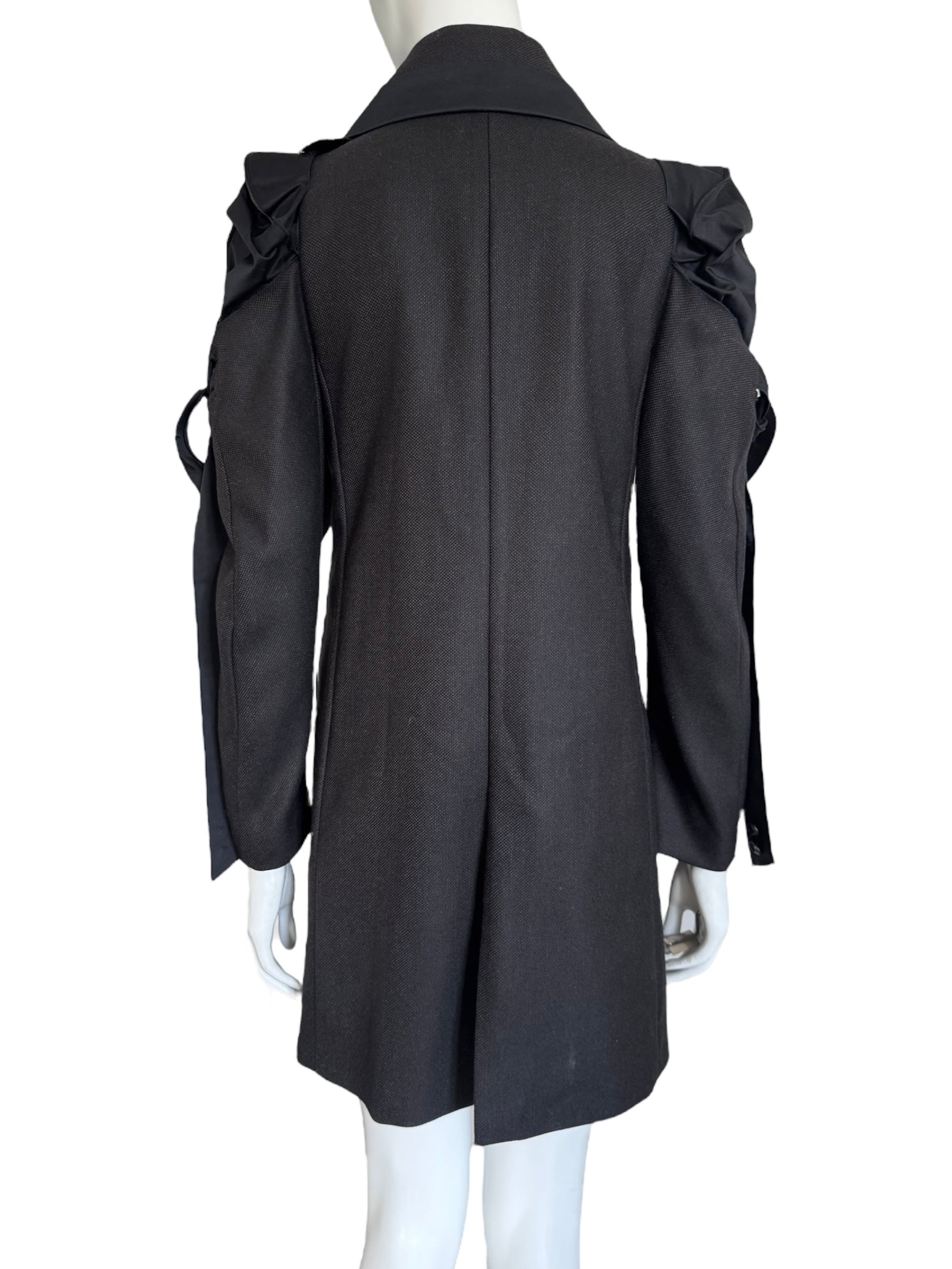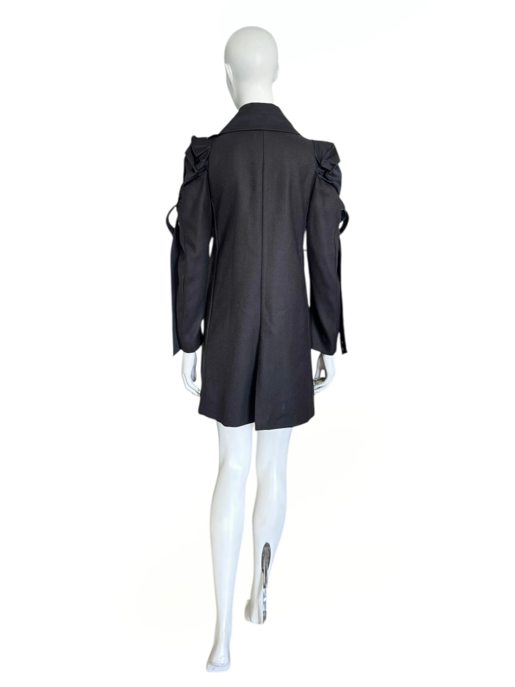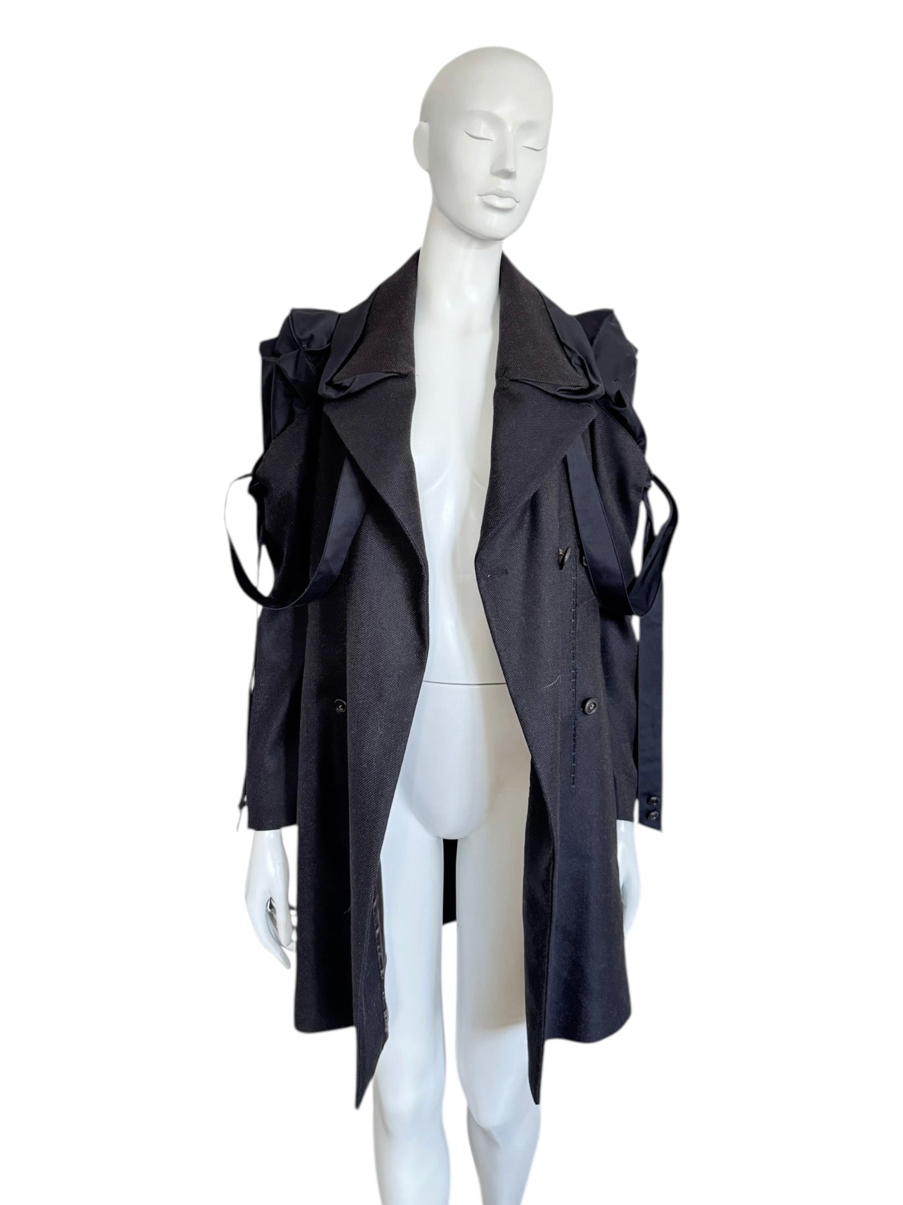 Manteau Marithé + François Girbaud à la coupe structurée, mêlant tailoring rigoureux et détails bondage.