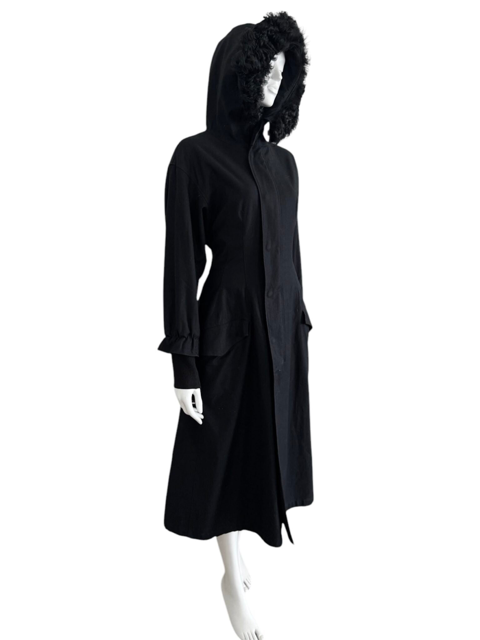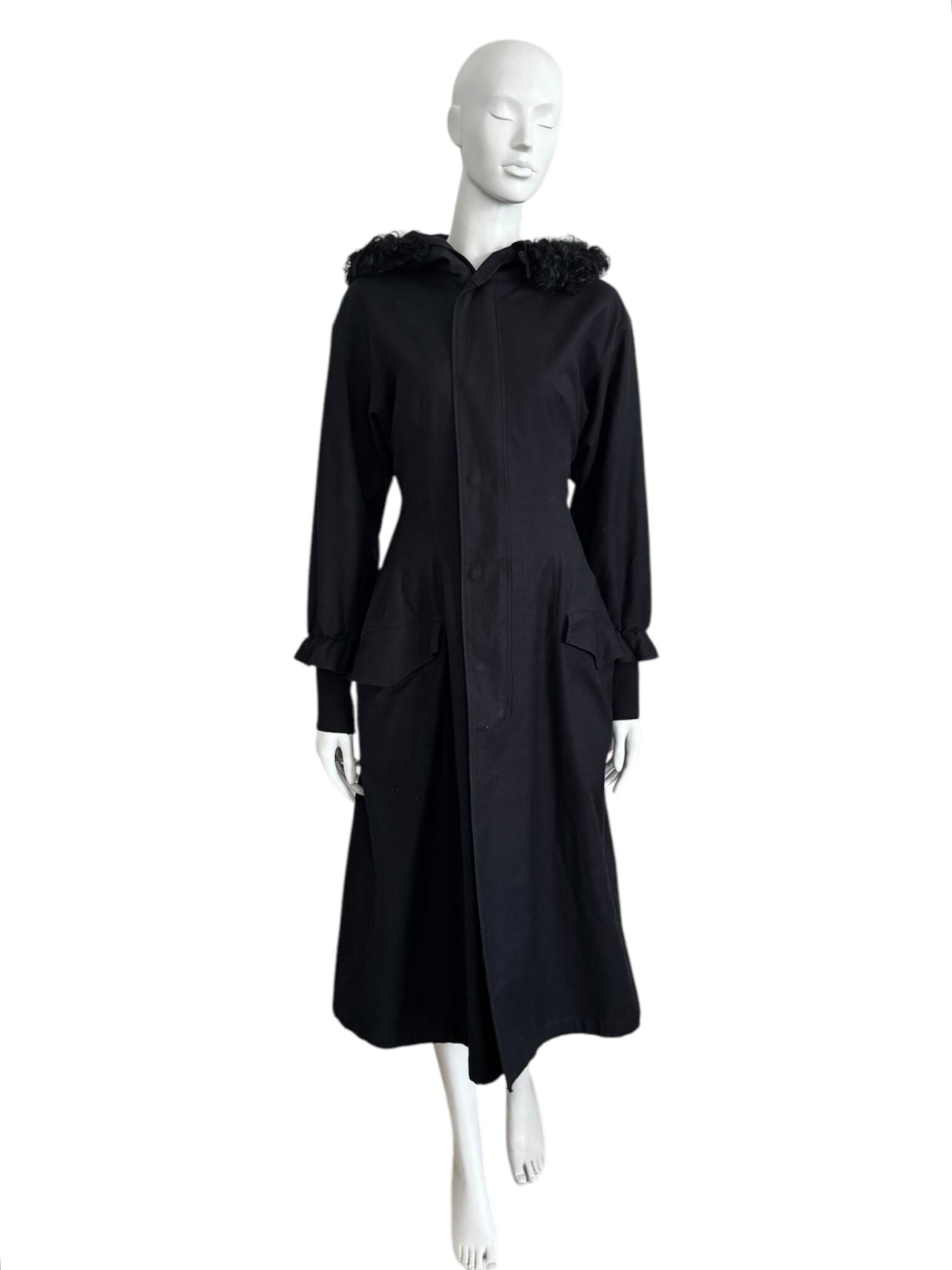 Matière technique en coton et fourrure synthétique, coupe utilitaire mais structurée, entre fonction et design.
