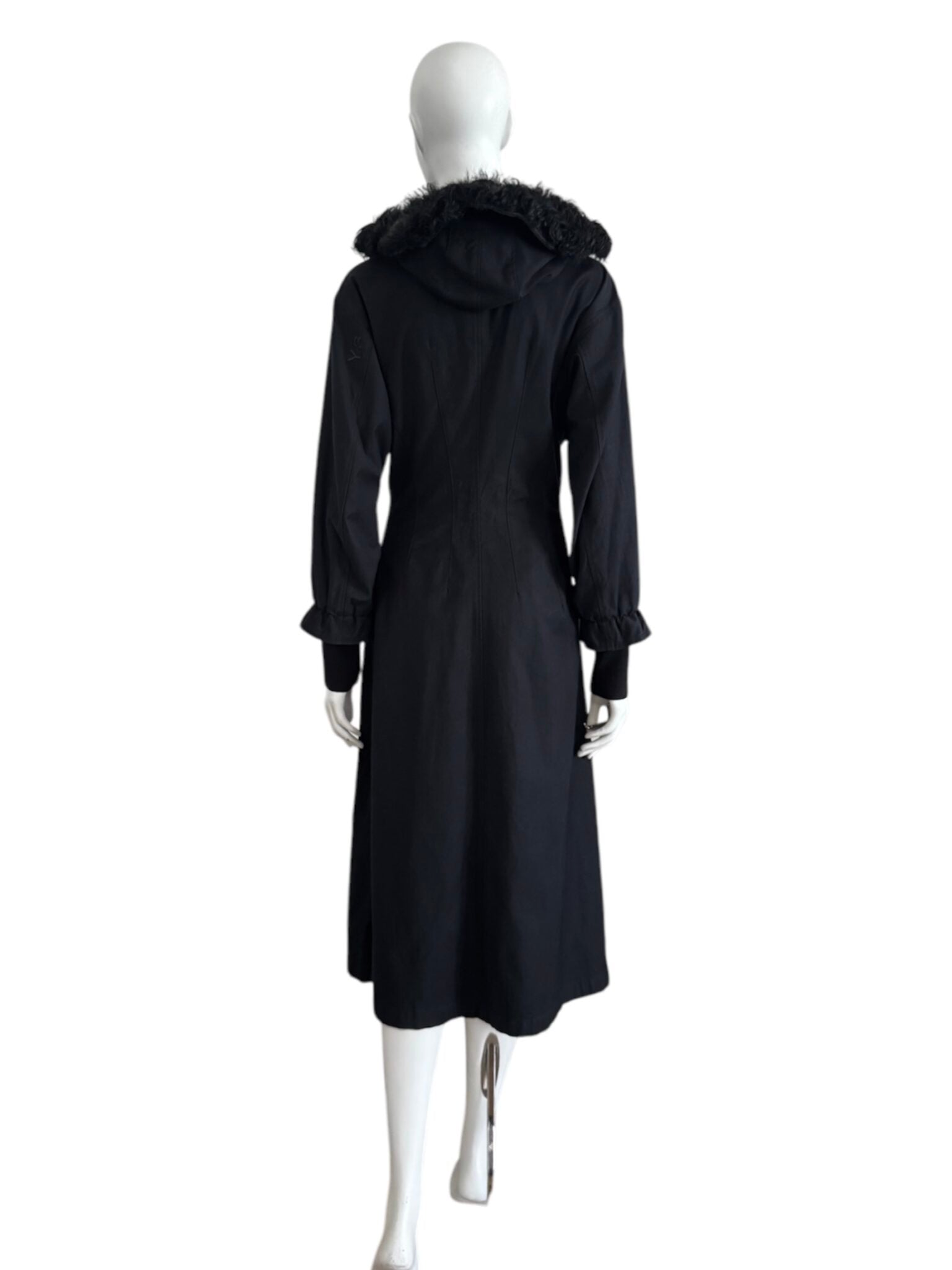 Manteau noir signé Y-3, la ligne hybride de Yohji Yamamoto x Adidas.