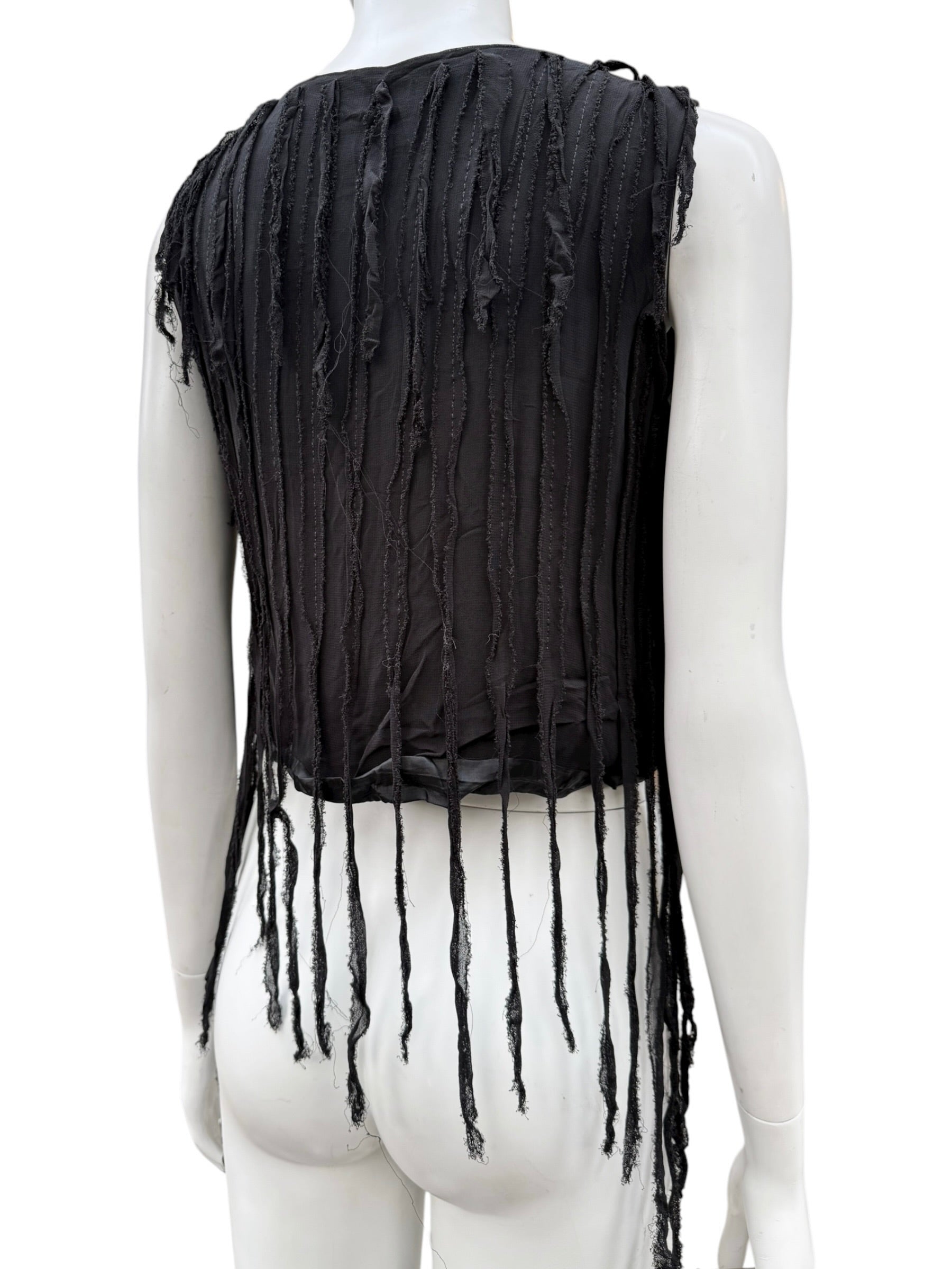 Top Moschino Cheap and Chic sans manches noir, orné de longues bandes effilées cousues verticalement sur l’ensemble du corps, dans un esprit négligé travaillé caractéristique des années 2000 chez Moschino Cheap and Chic.