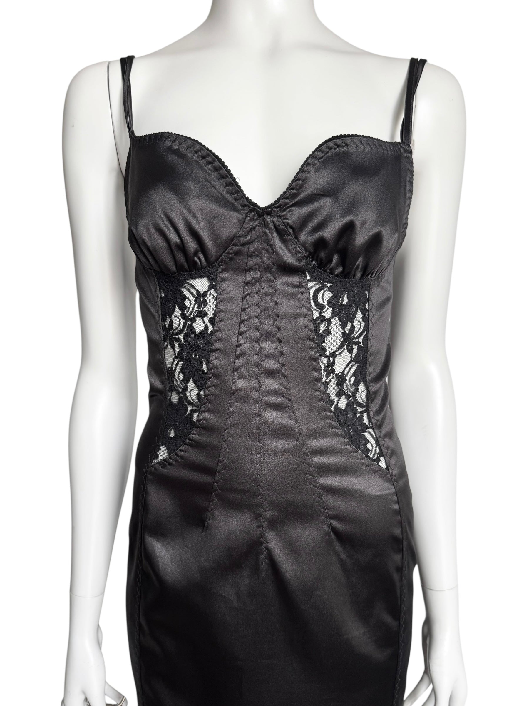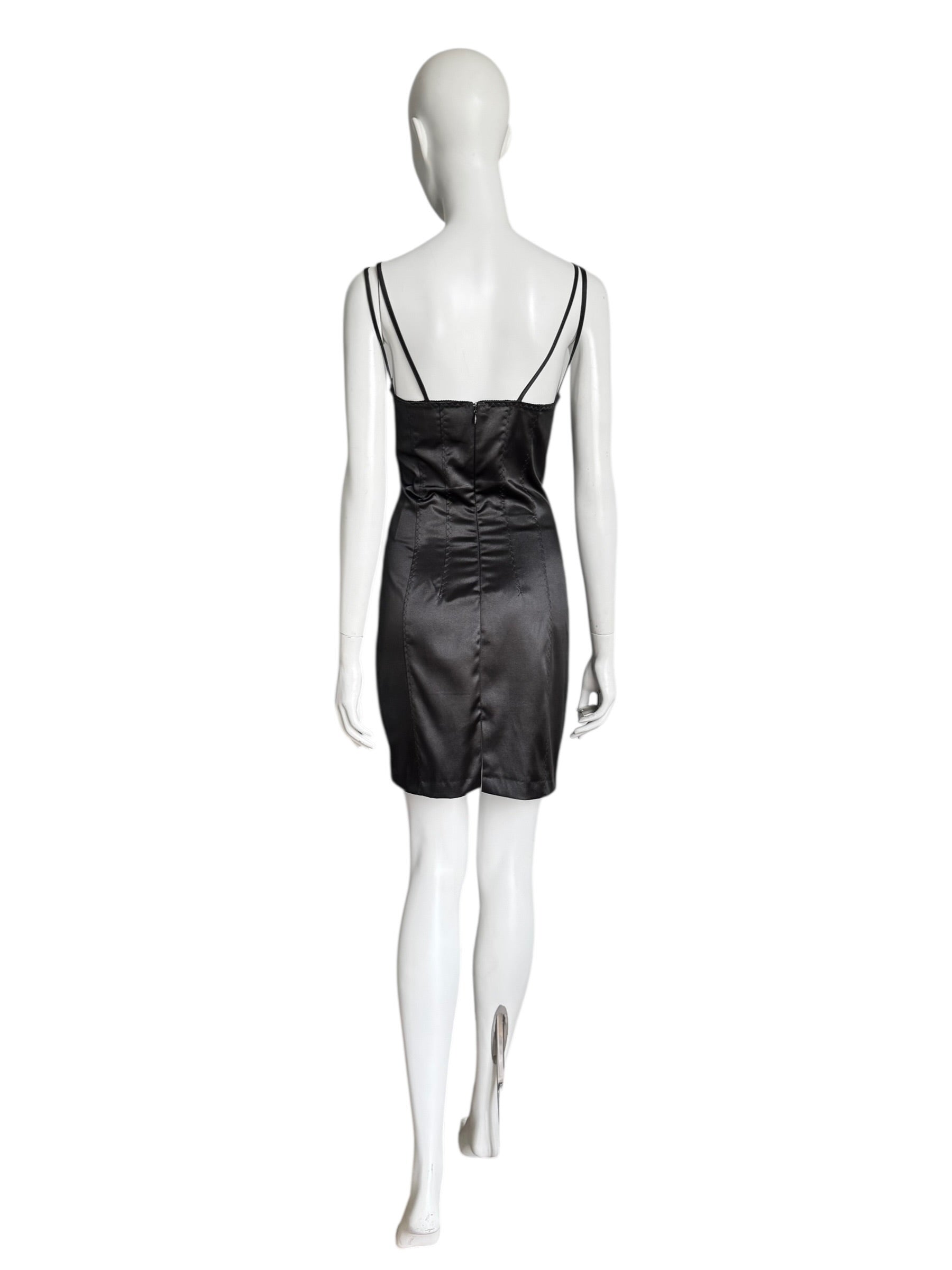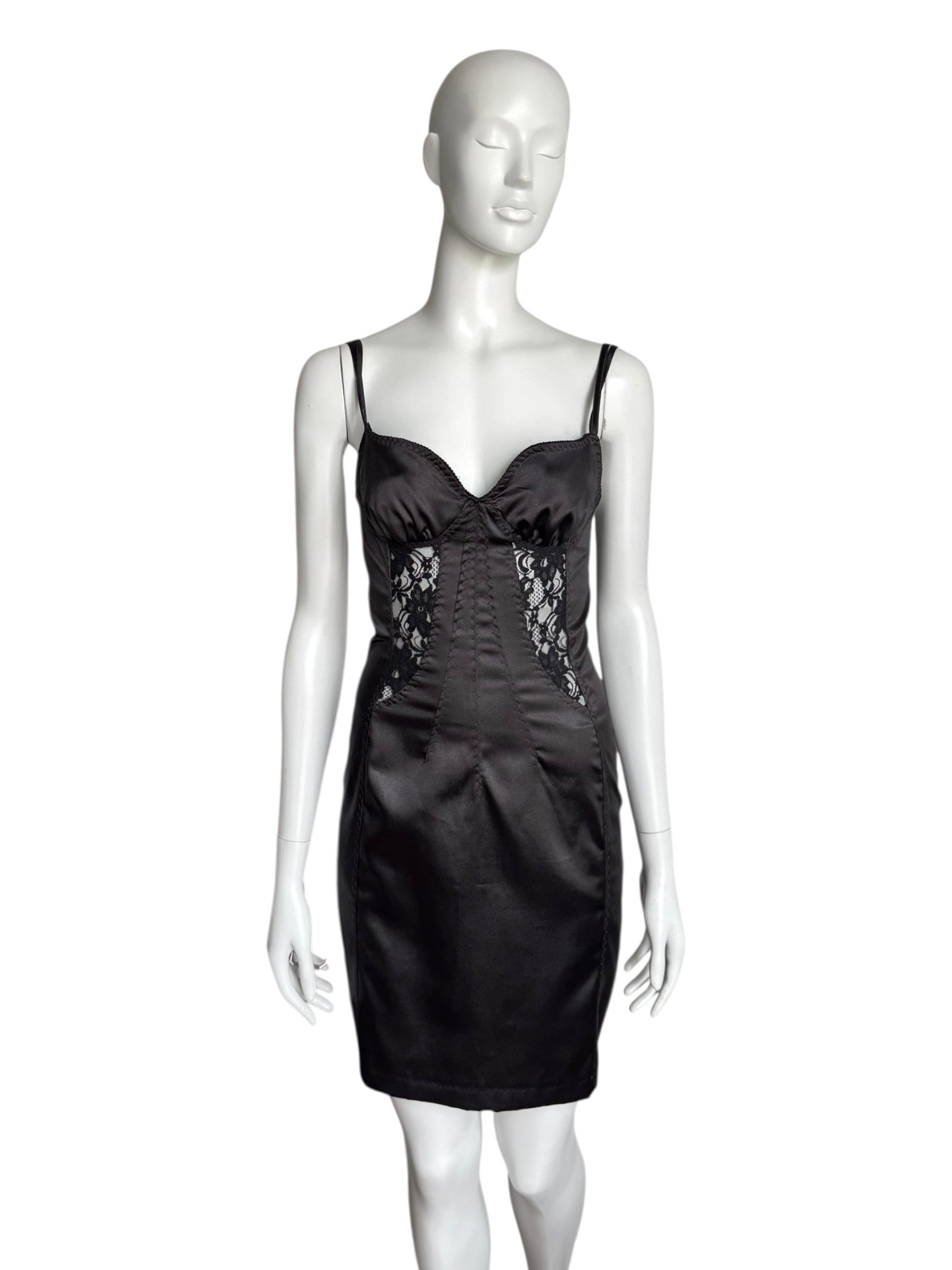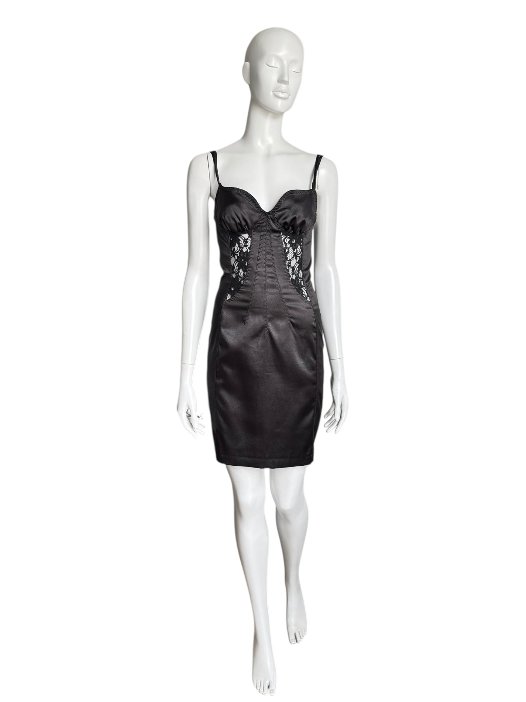 Robe iconique de la ligne D&G f/w 2003, typique des archives 2000s de la maison italienne. Corset structuré en satin synthétique, inserts en dentelle transparente, et fines doubles bretelles. Silhouette ajustée, zip au dos. Une pièce collector de l’ère pre-Dolce couture, rarement disponible dans cet état. Made in Italy.