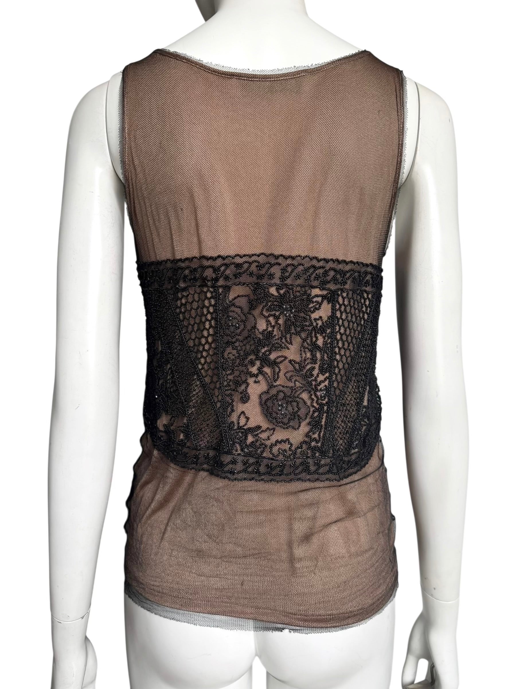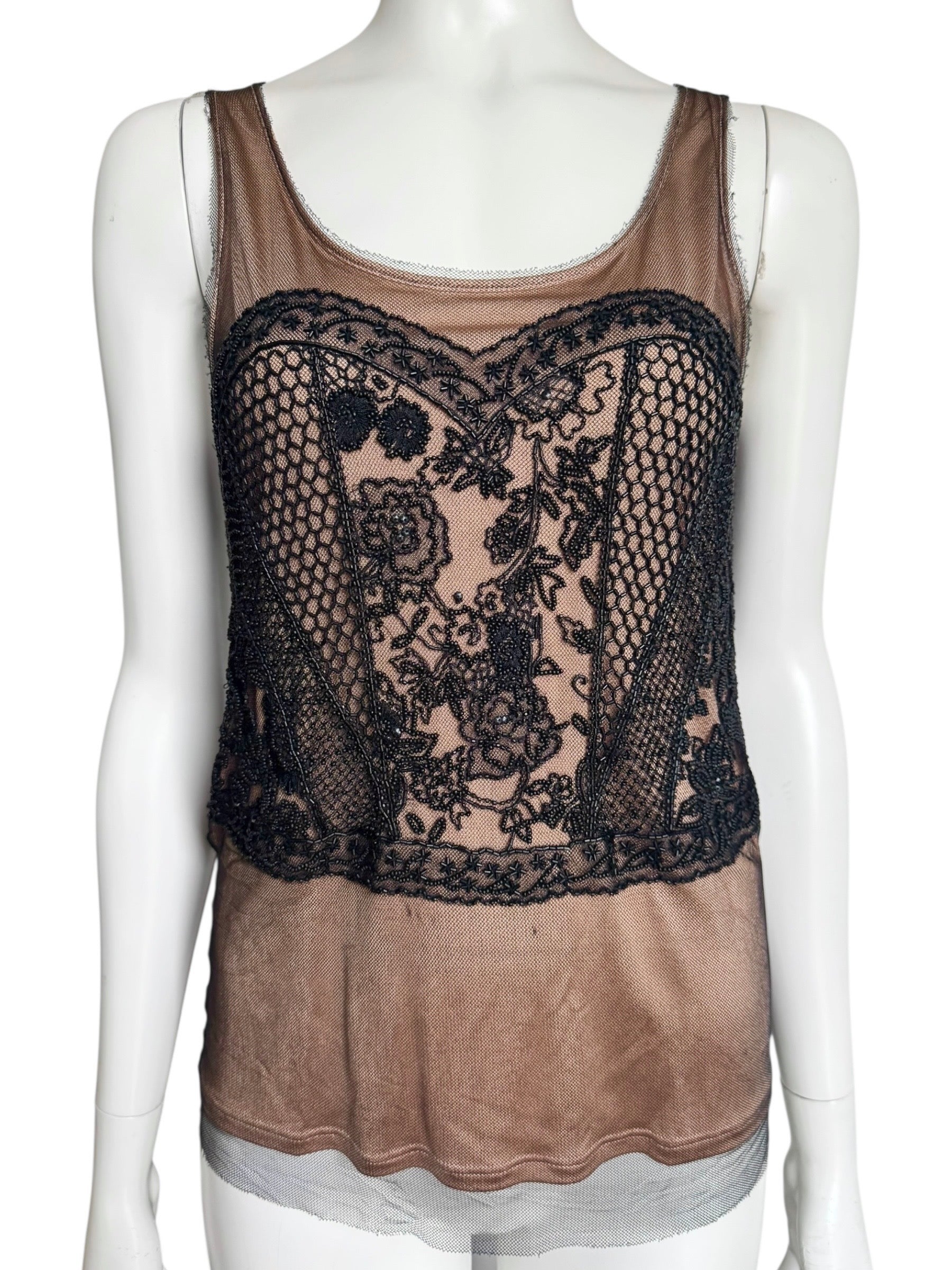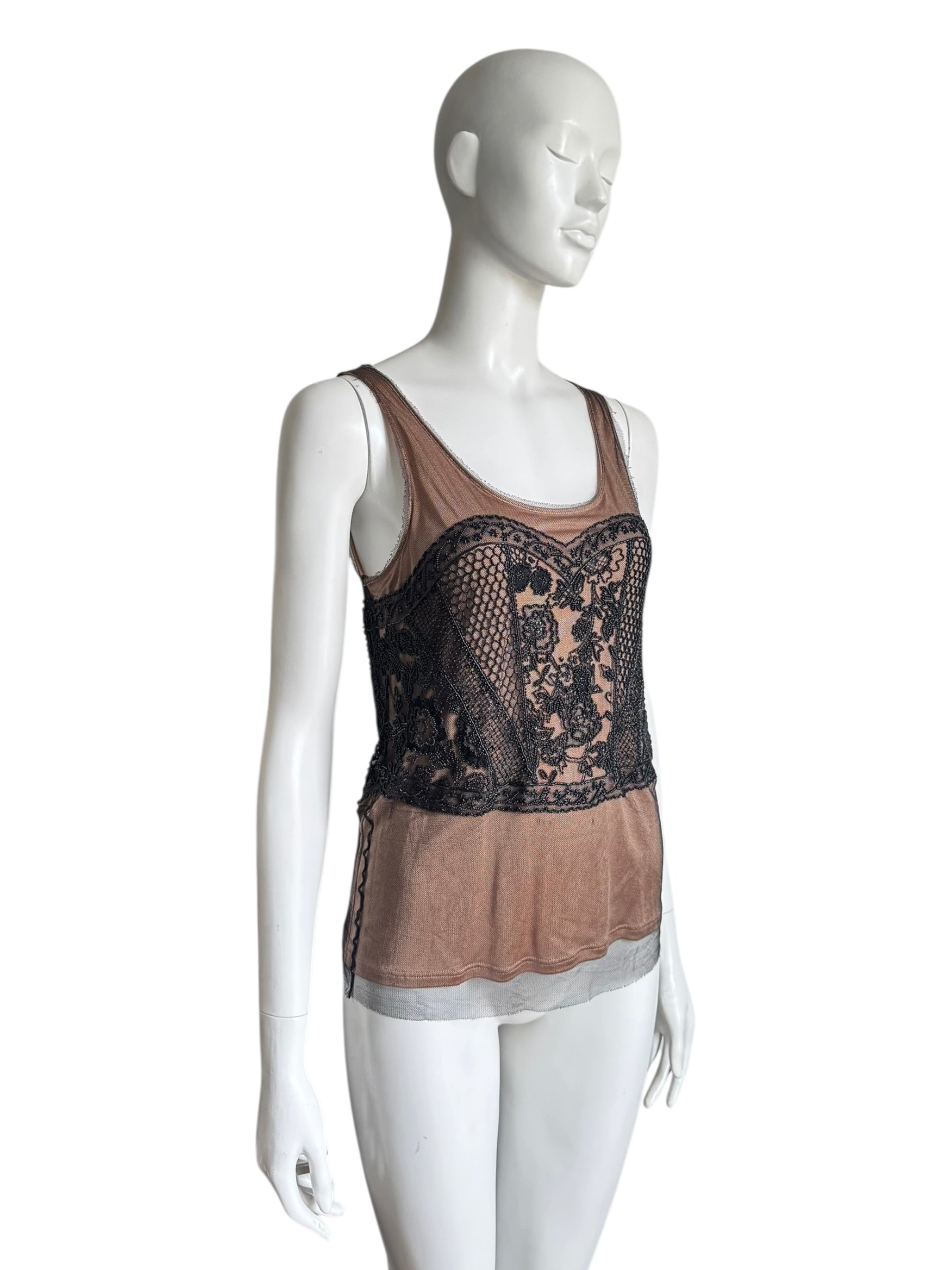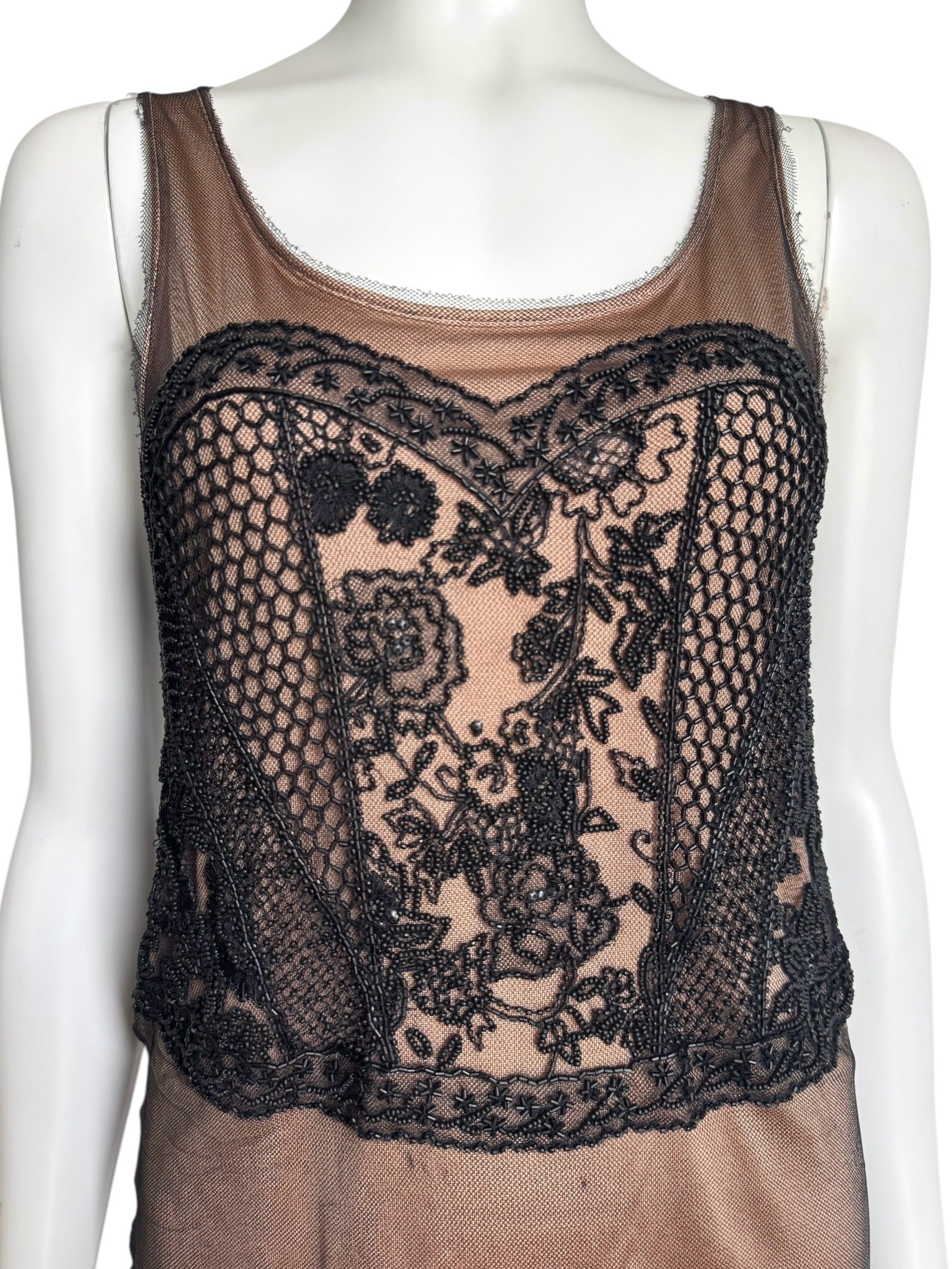 Débardeur Dior par John Galliano en tulle de soie rose poudré, brodé à la main de perles de verre noires formant un motif floral et graphique évoquant un corset.