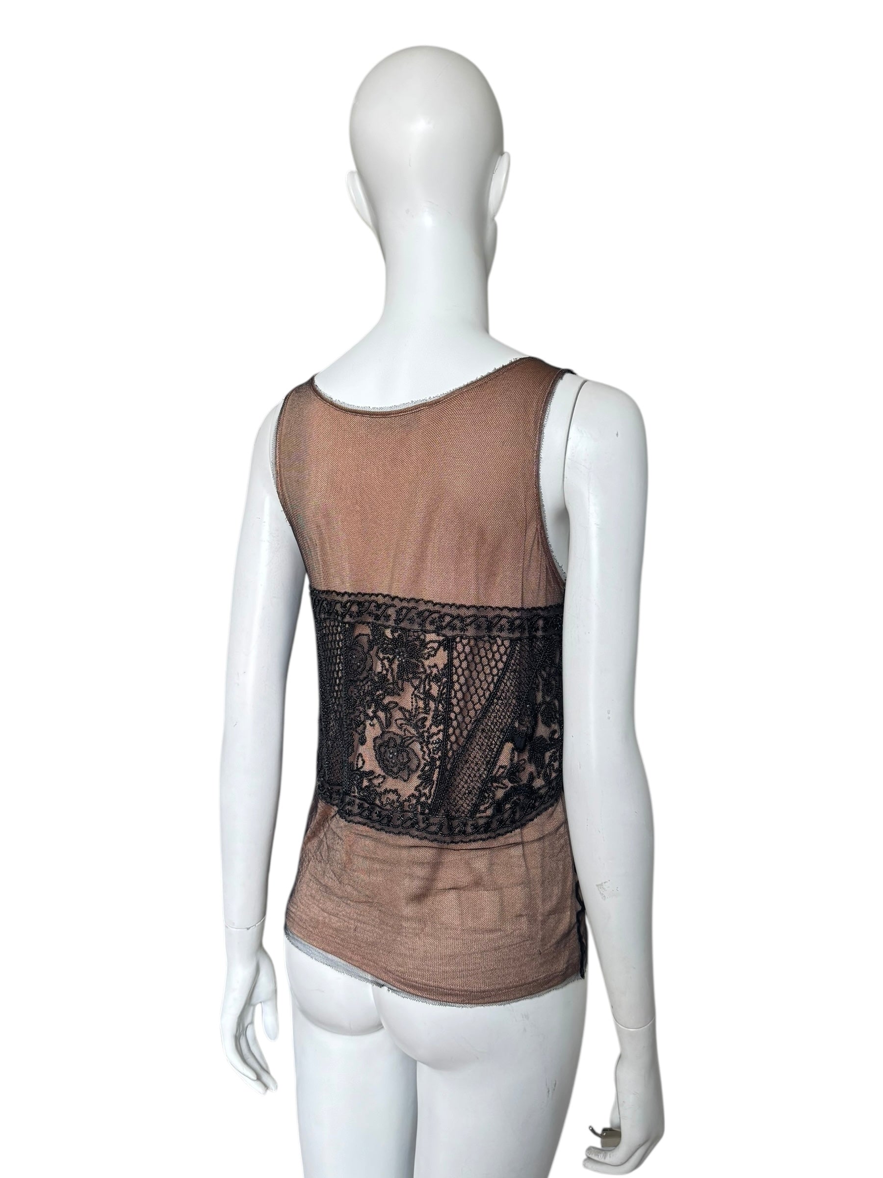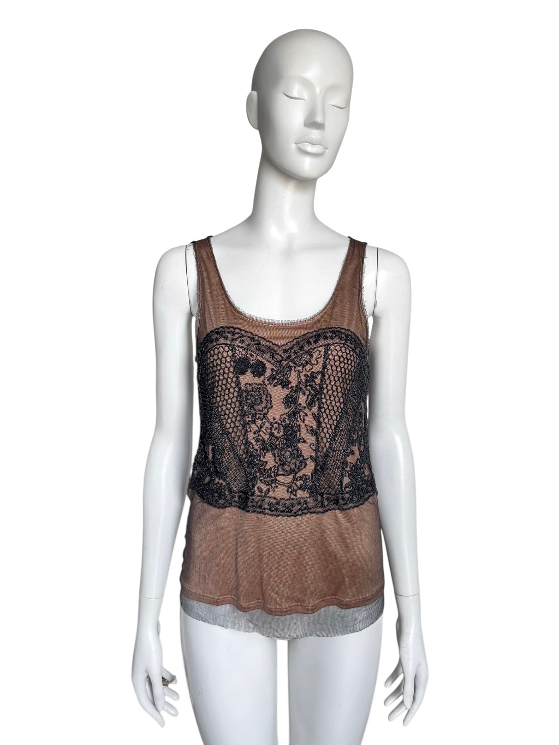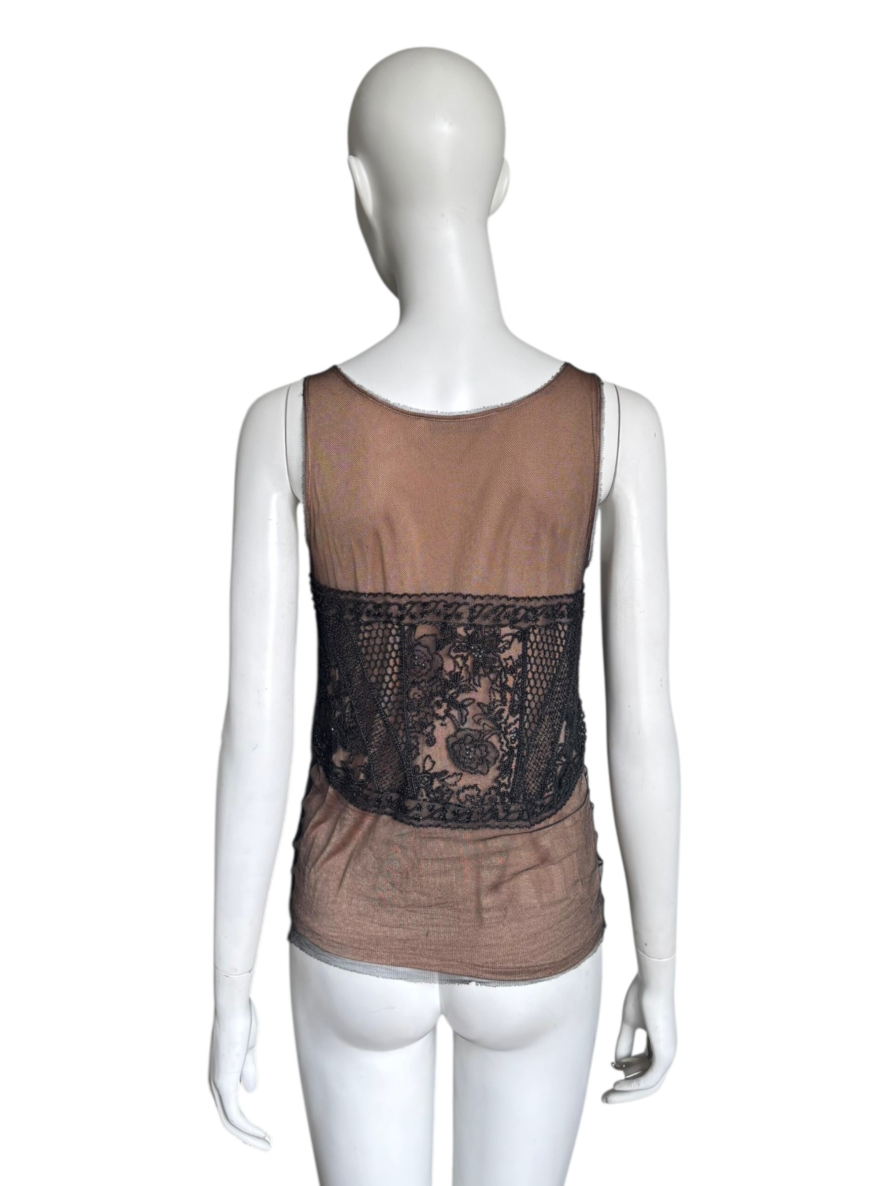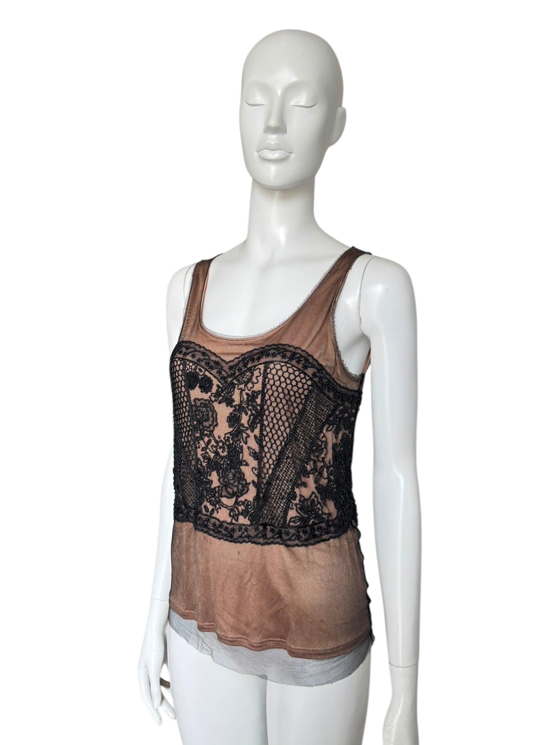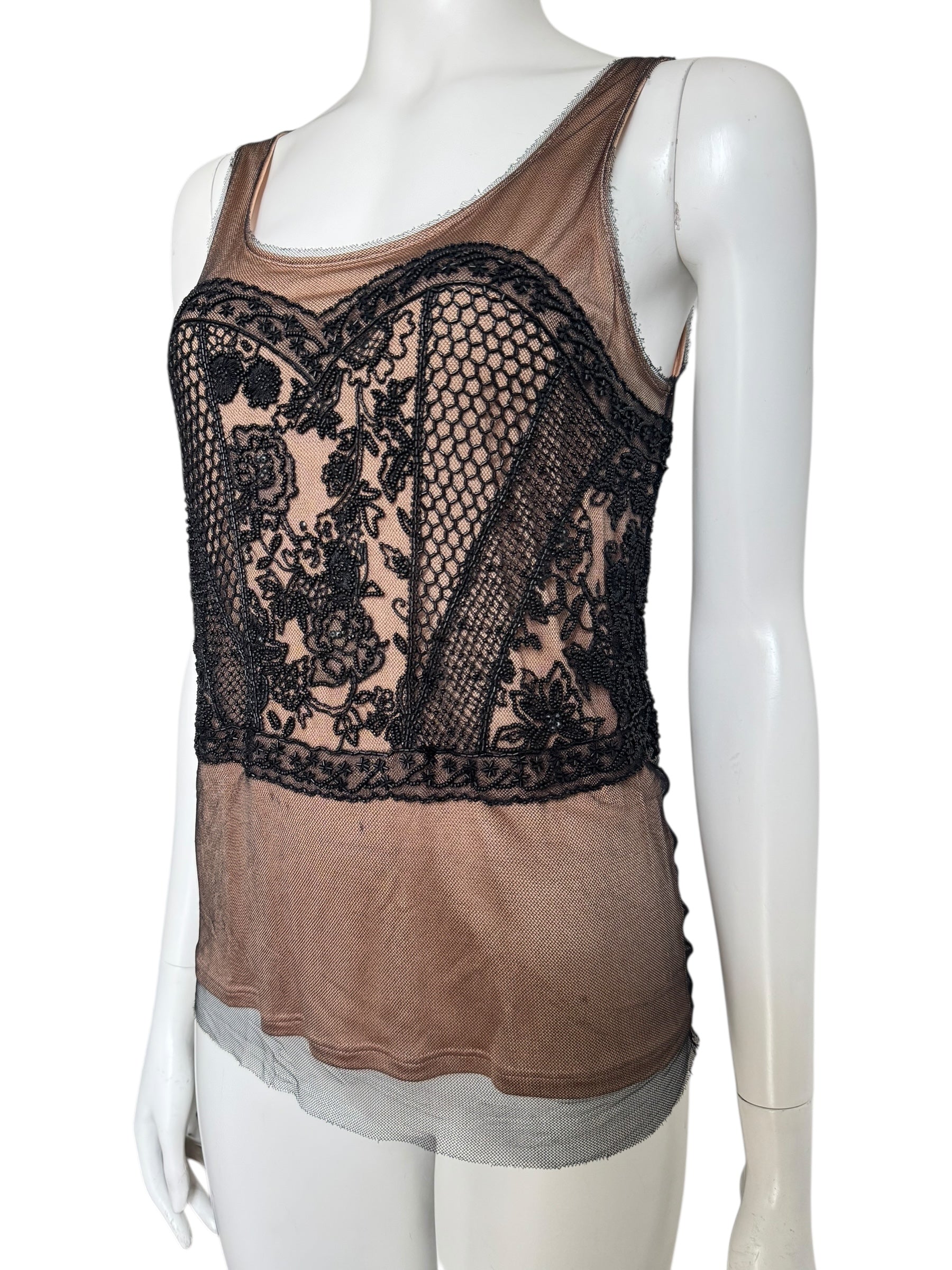 Débardeur Dior par John Galliano en tulle de soie rose poudré, brodé à la main de perles de verre noires formant un motif floral et graphique évoquant un corset.