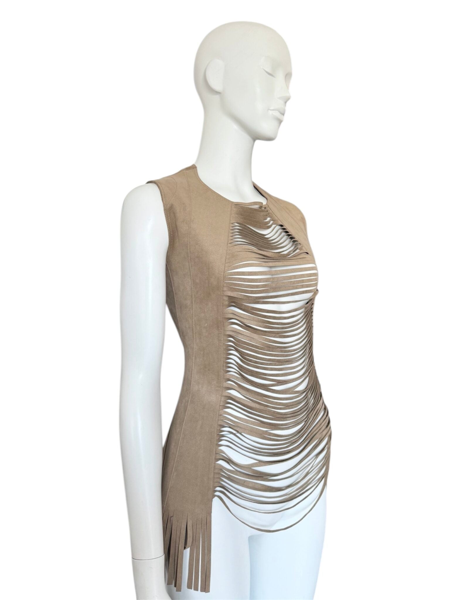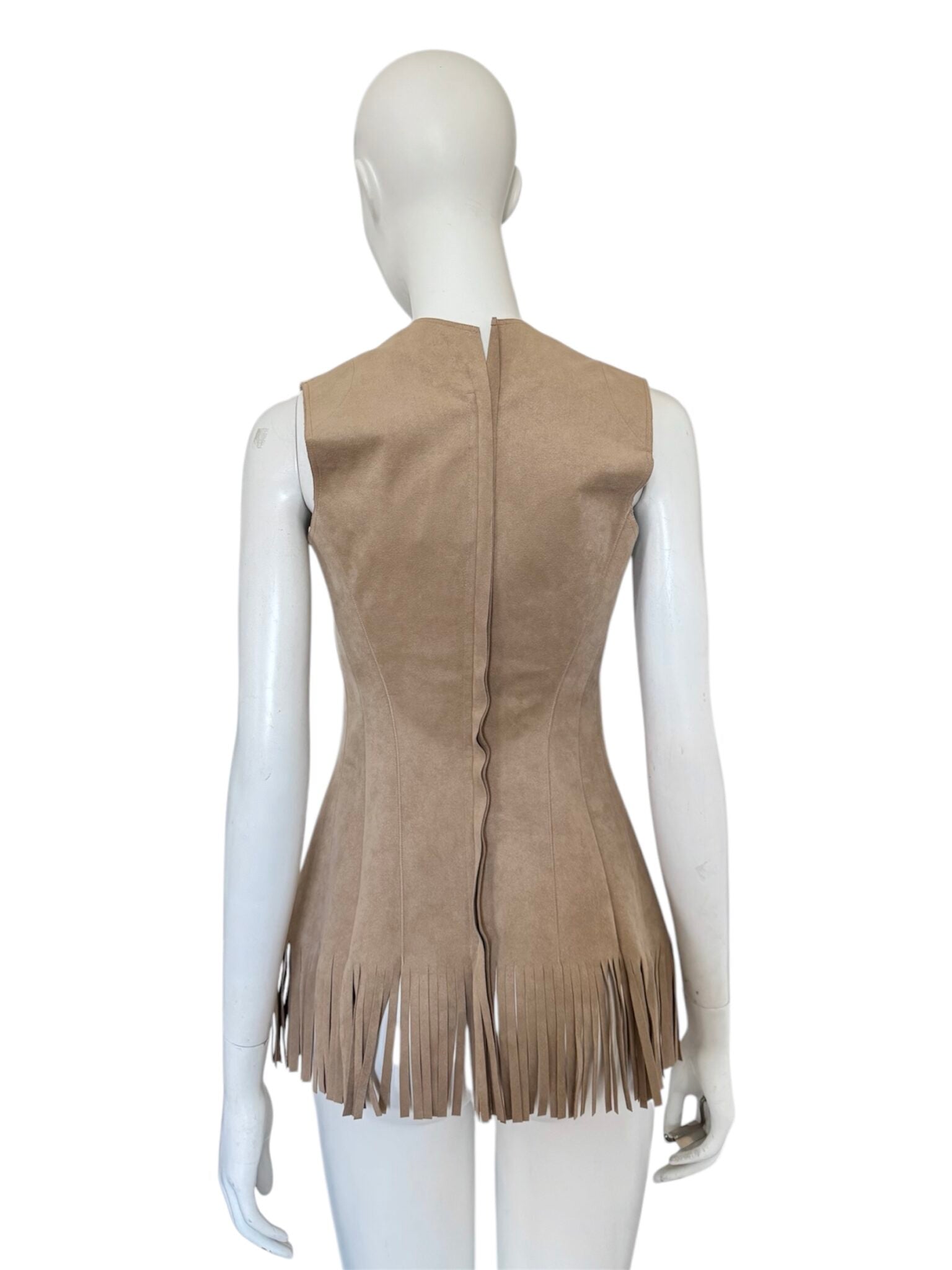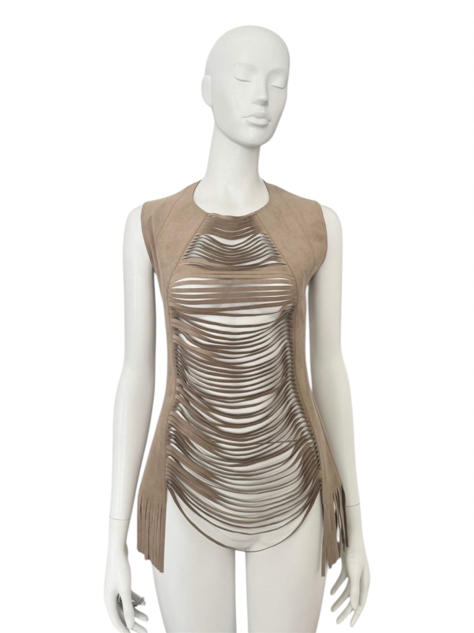 Top Junya Watanabe – Comme Des Garçonsprintemps/été 2014 en suédine à franges. Fermeture au dos par un zip.