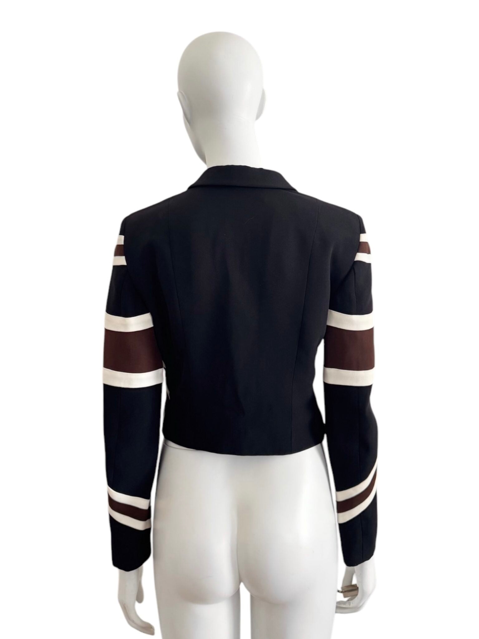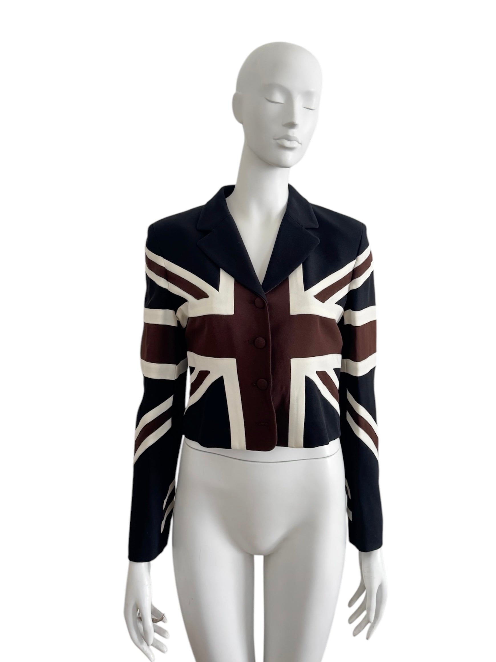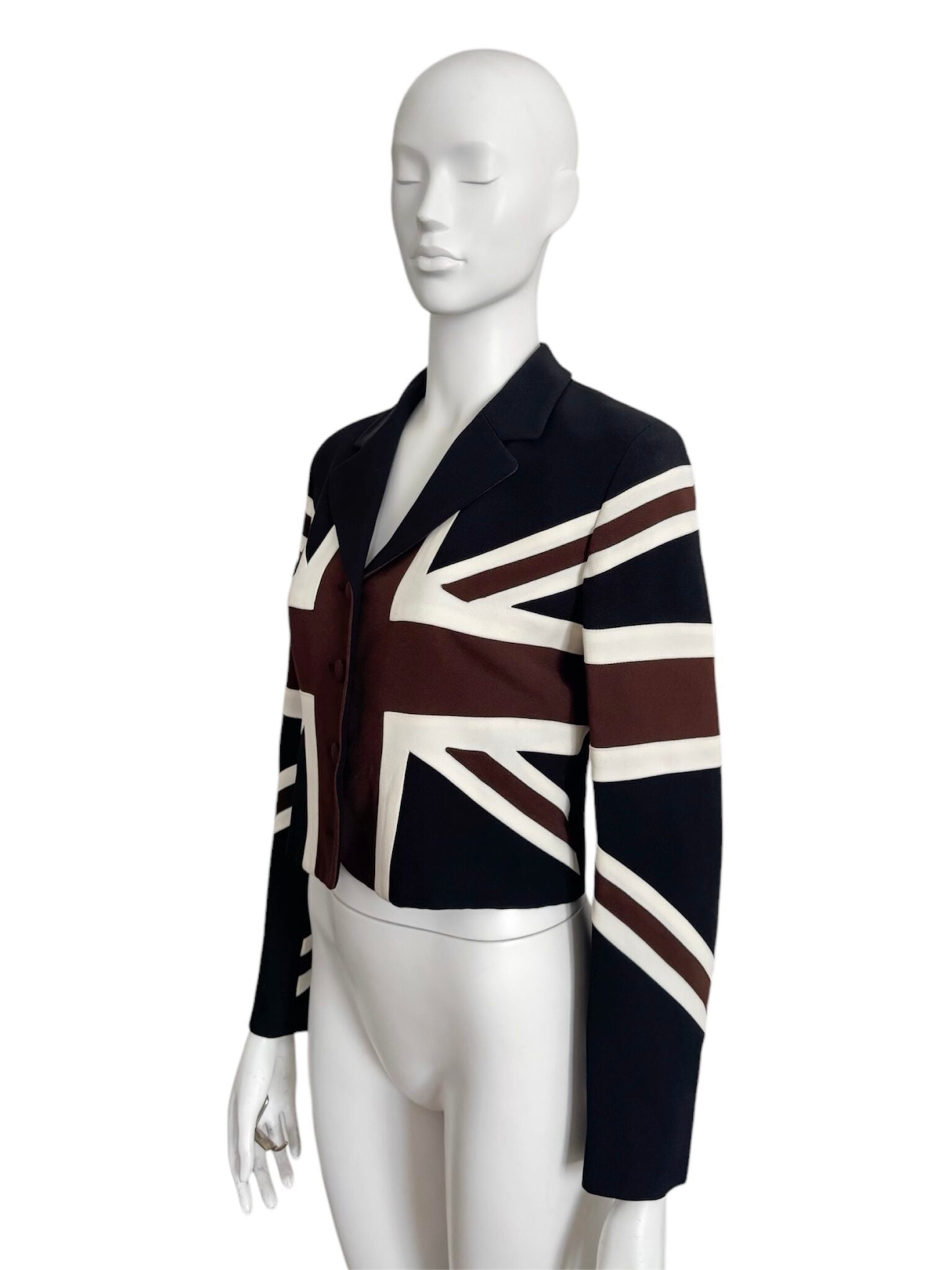 Veste courte Moschino Cheap and Chic, imprimé Union Jack noir, blanc et marron, modèle aperçu dans la série culte « The Nanny ».